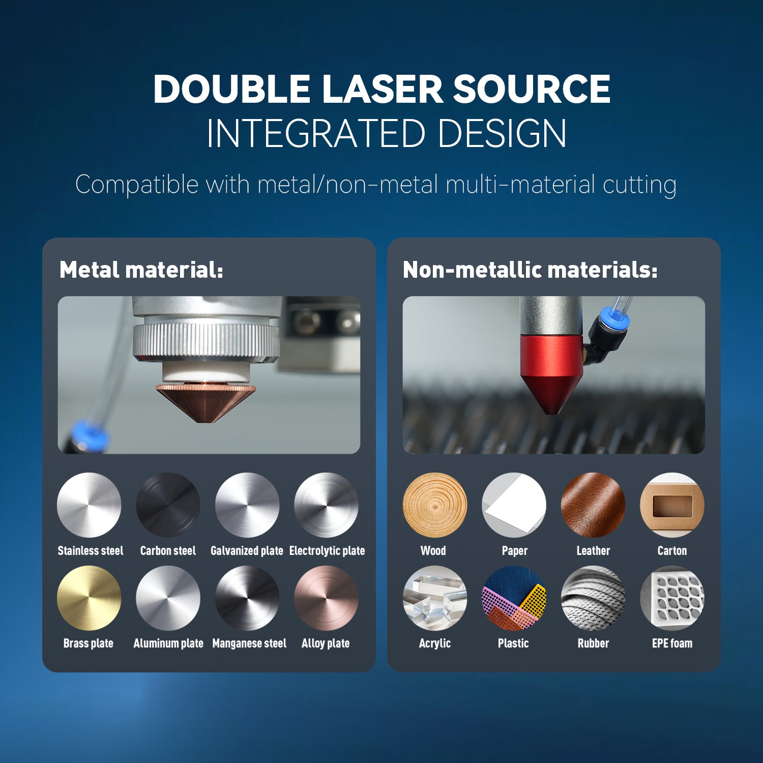 Double laser source (1500W Fiber Laser Power and 130W-180W CO2 Laser Power), integrated design, compatible with metal/non-metal multi-material cutting.