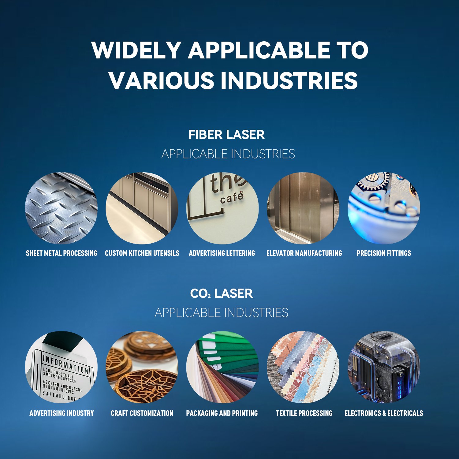 CO2 Laser Applicable Industries: Advertising Industry, Craft Customization, Packaging and Printing, Textile Processing, Electronics & Electricals