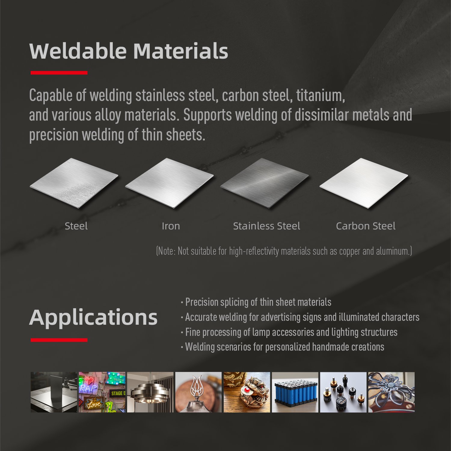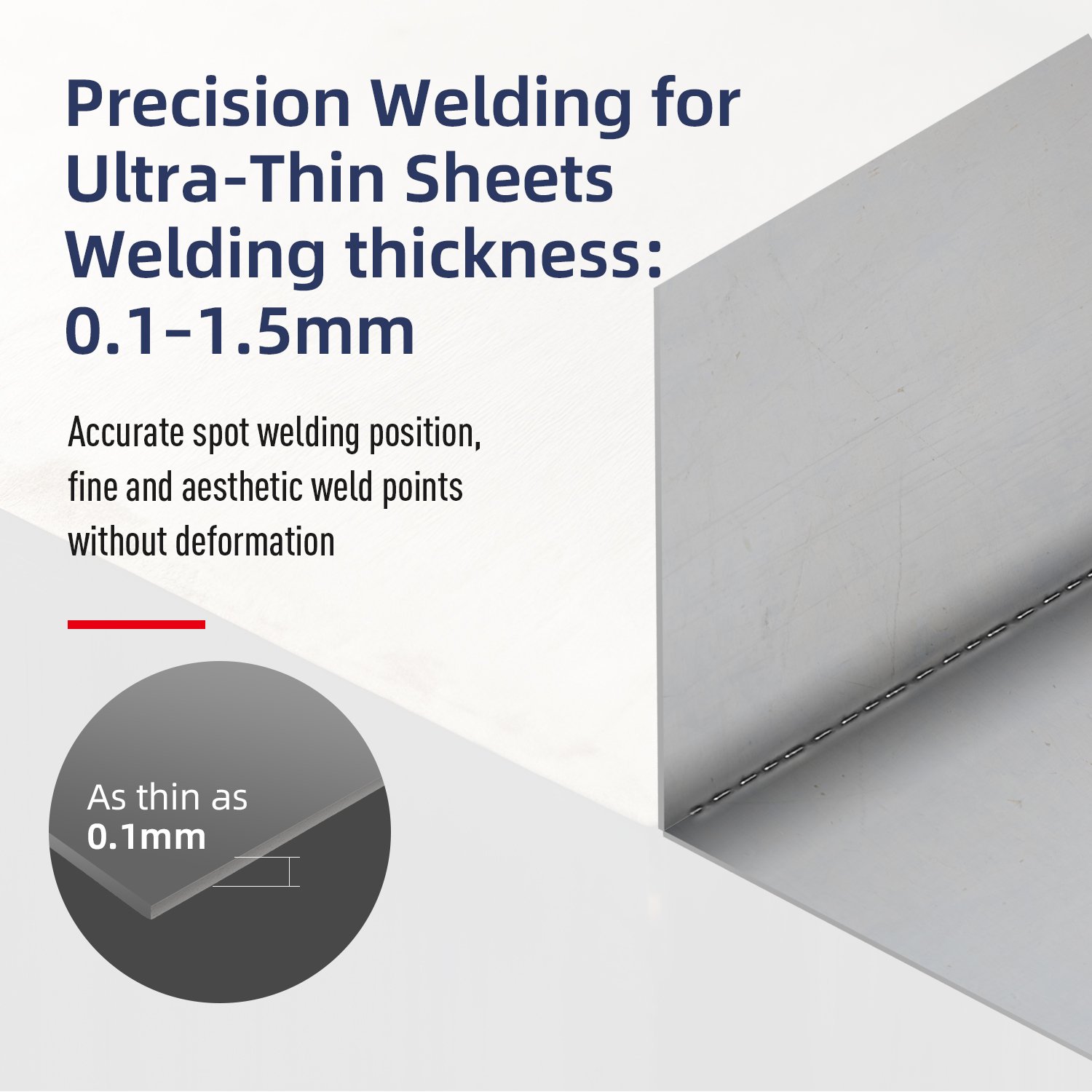 • Ultra-thin Precision Welding: Suitable for 0.1-1.5mm thin plate welding, advertising lettering, lighting products, and DIY crafts with mark-free backside forming.