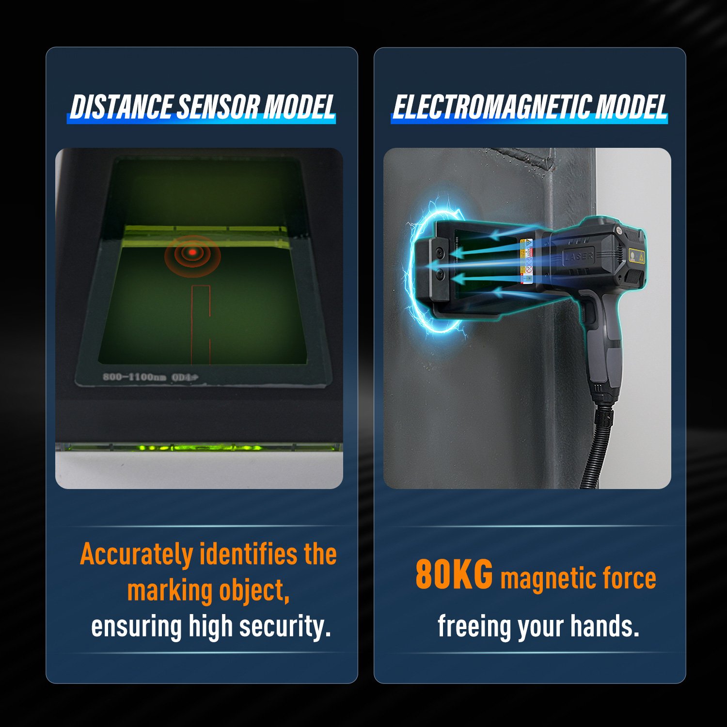 • Compact, Lightweight and Portable: This handheld laser marking machine is designed for maximum portability, with a total weight of 7.0-9.8kg. Gun head 1.3kg (electromagnetic model 2kg).