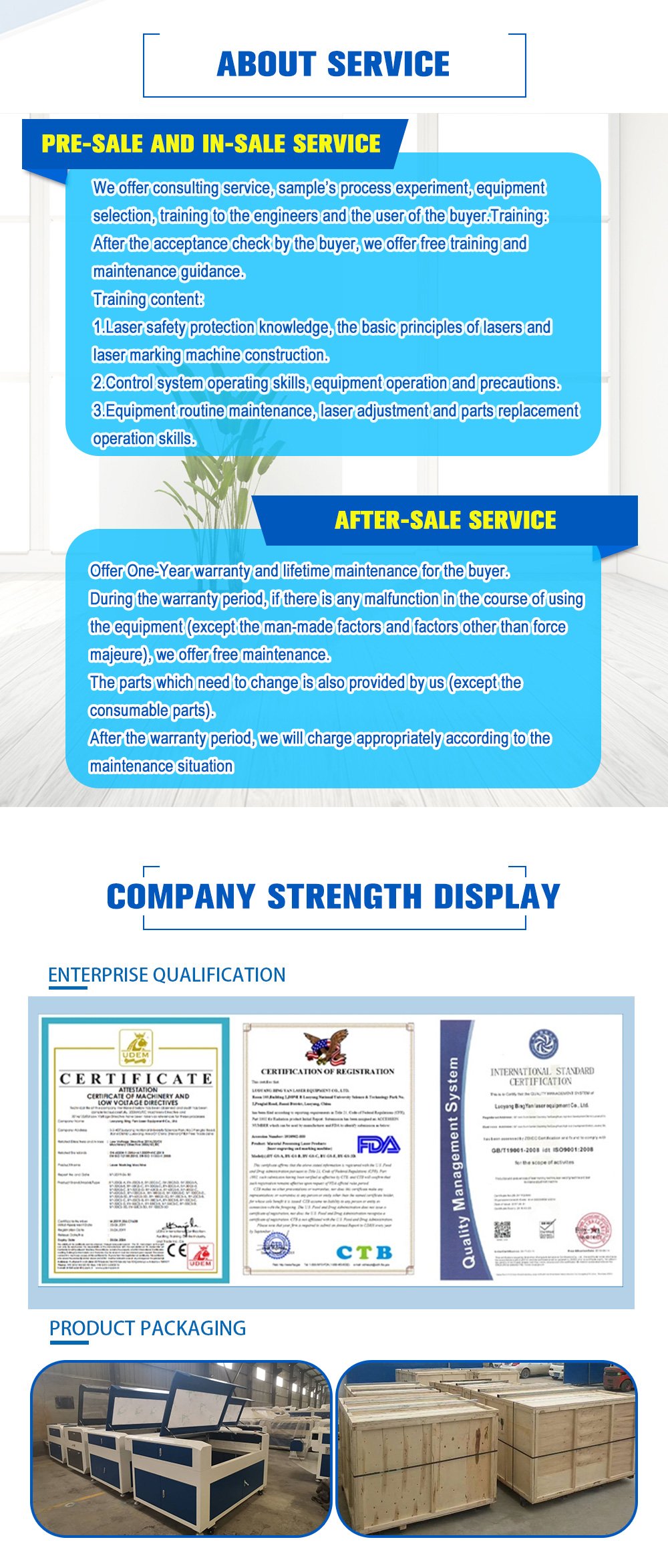 • One Year Warranty. CE, ISO & FDA Certificate. Free Sample Test. Free Training and Maintenance Guidance.