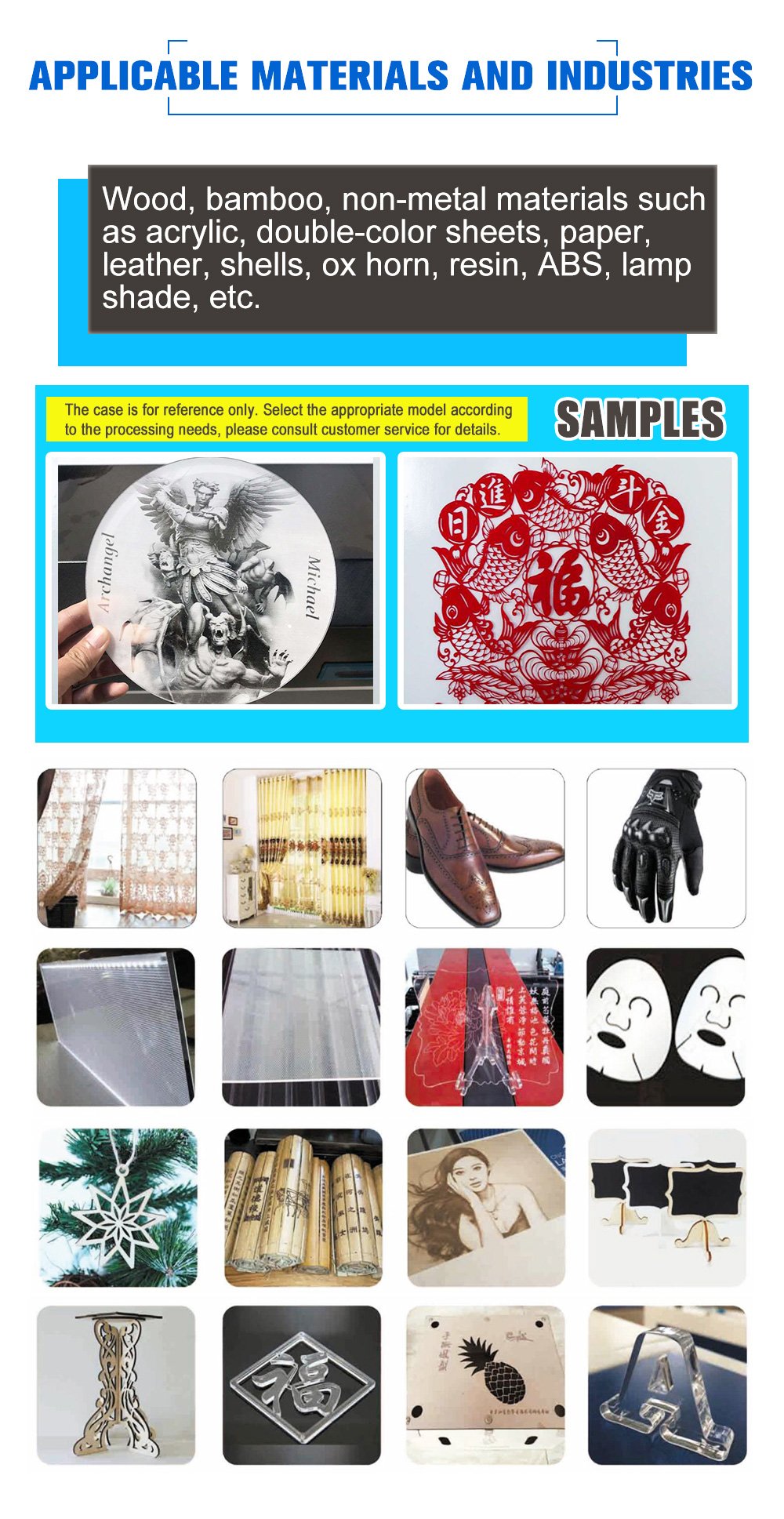 • Applicable Material: Wood, Acrylic, Double-color Sheets, Glass, Marble, PVC, Paper, Leather, Shells, ABS, Lamp Shade, etc